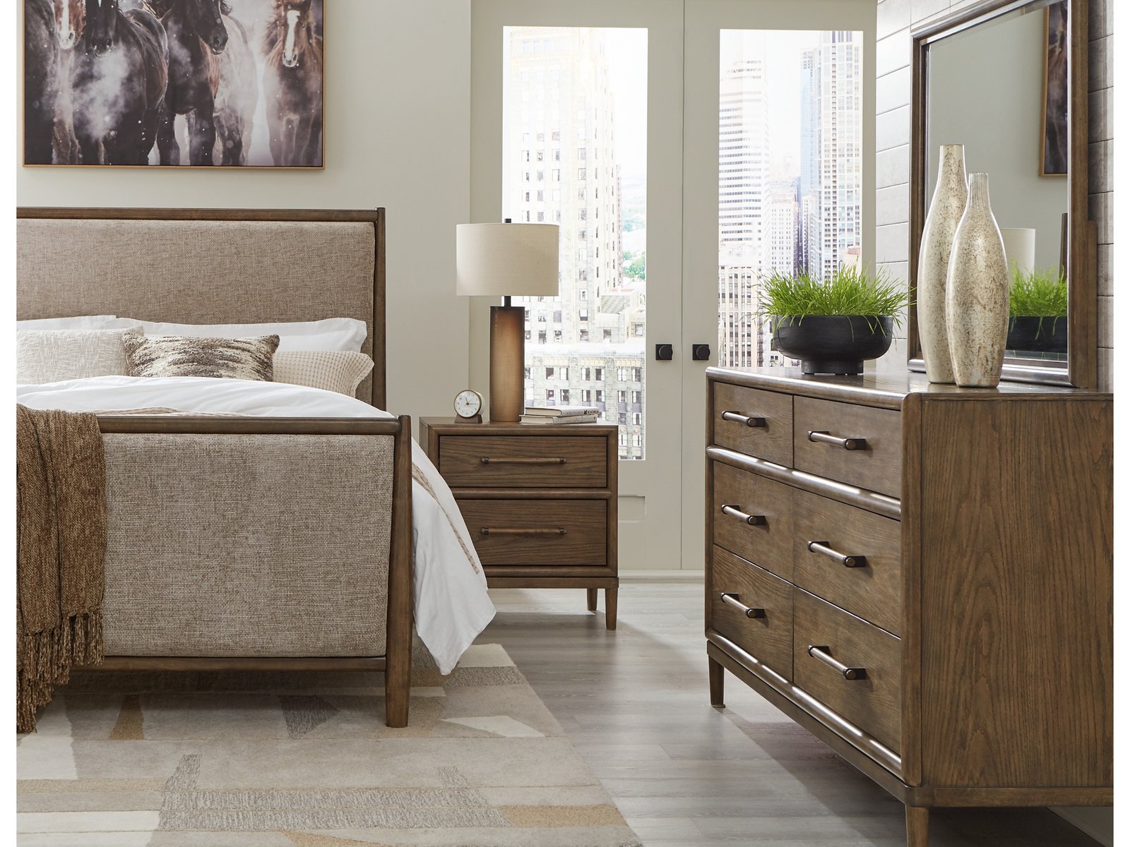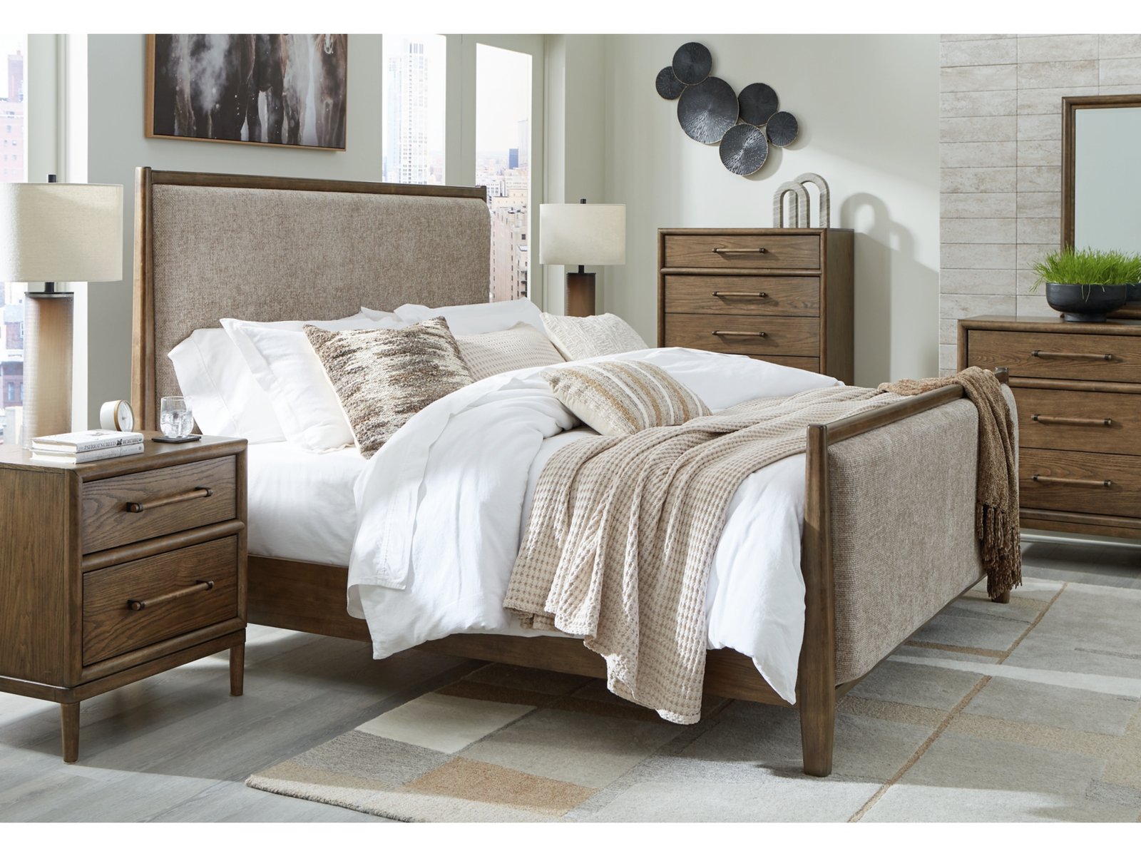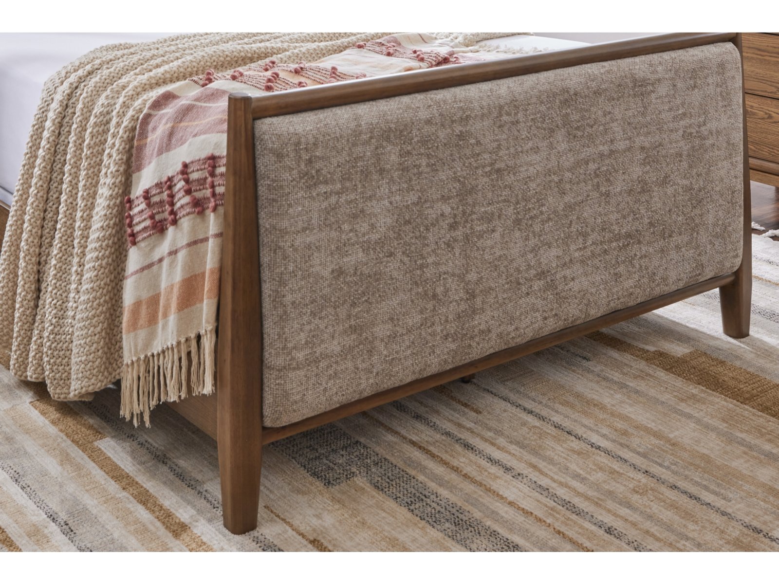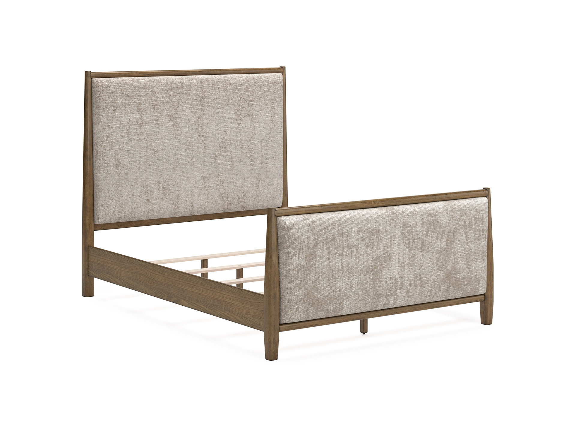 Give your mid-century modern bedroom that finishing touch with the Roanhowe queen upholstered bed. Its softly woven fabric, encased in a well-crafted frame, enhances the design with stunning style. This bed takes minimalism to the max.