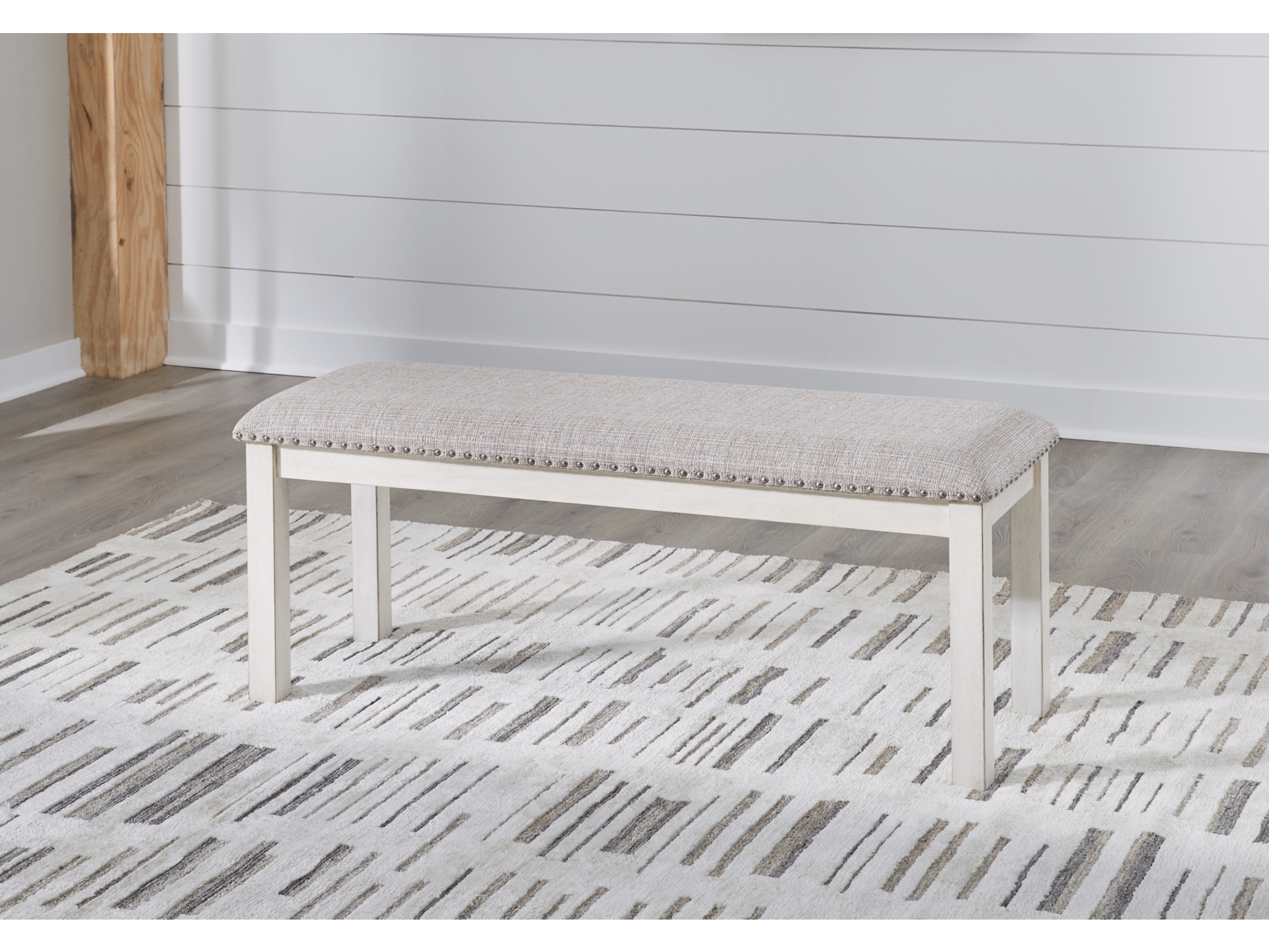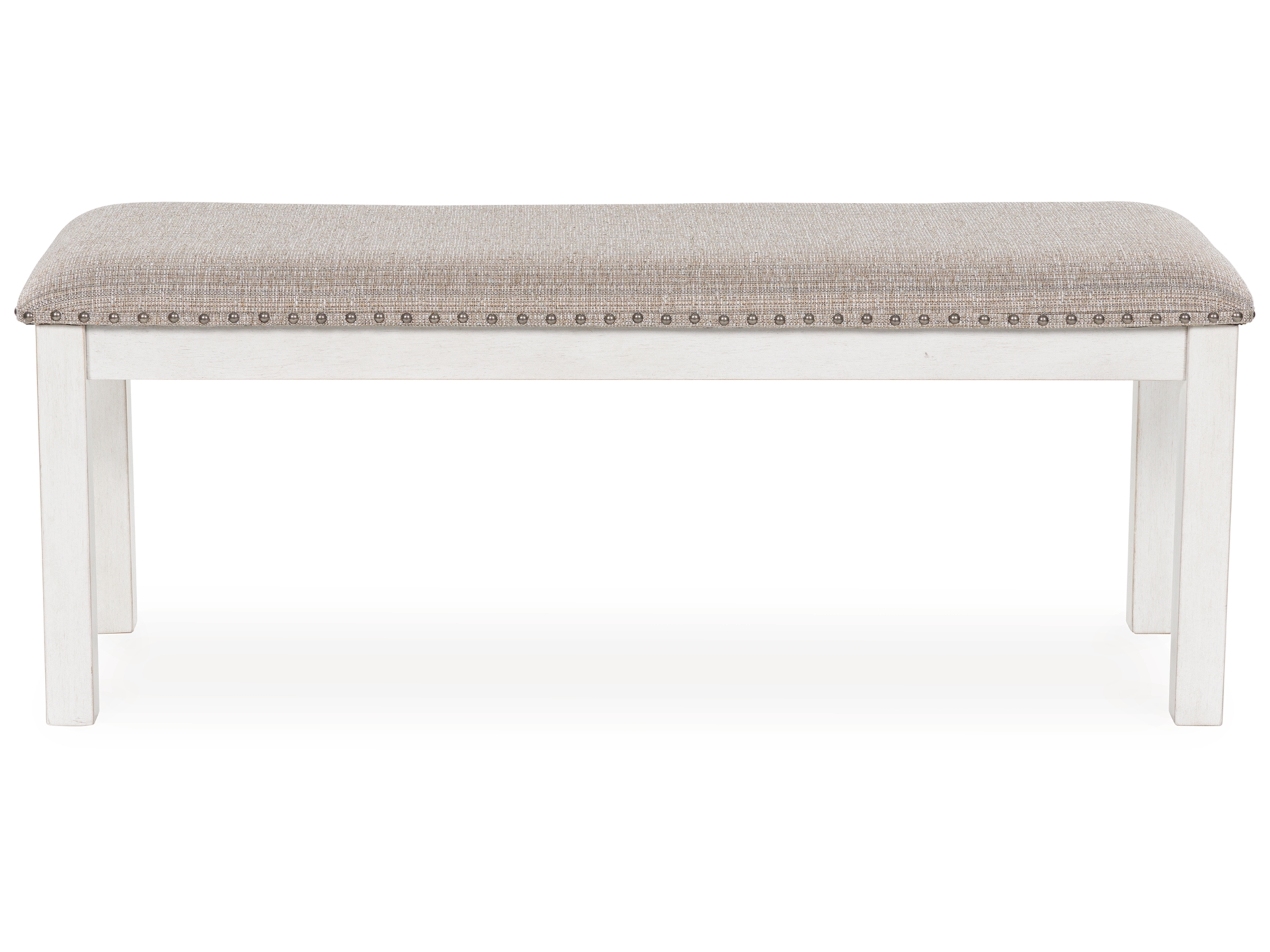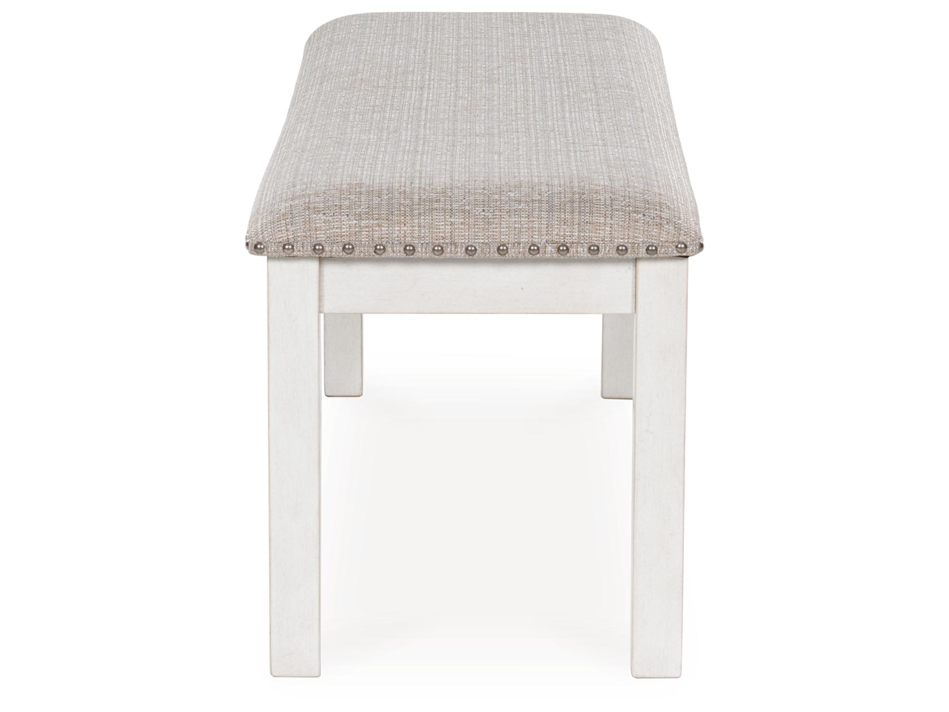 The Robbinsdale dining bench is sure to impress come mealtime. With its antiqued white finish and light gray upholstery with nailhead trim, modern farmhouse-style dining has never been so fashionable. All that’s missing is you and your family.