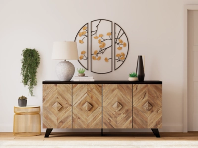 Diamond life. Make a bold, brilliant statement with the Robin Ridge 4-door accent cabinet. Its two-tone styling merges a dark brown exterior with a multi-tonal distressed finish on the doors and handles. A diamond-shaped plank effect brings rich, dimensional flair to the scene. Adjustable shelving makes this high-end accent piece highly functional.