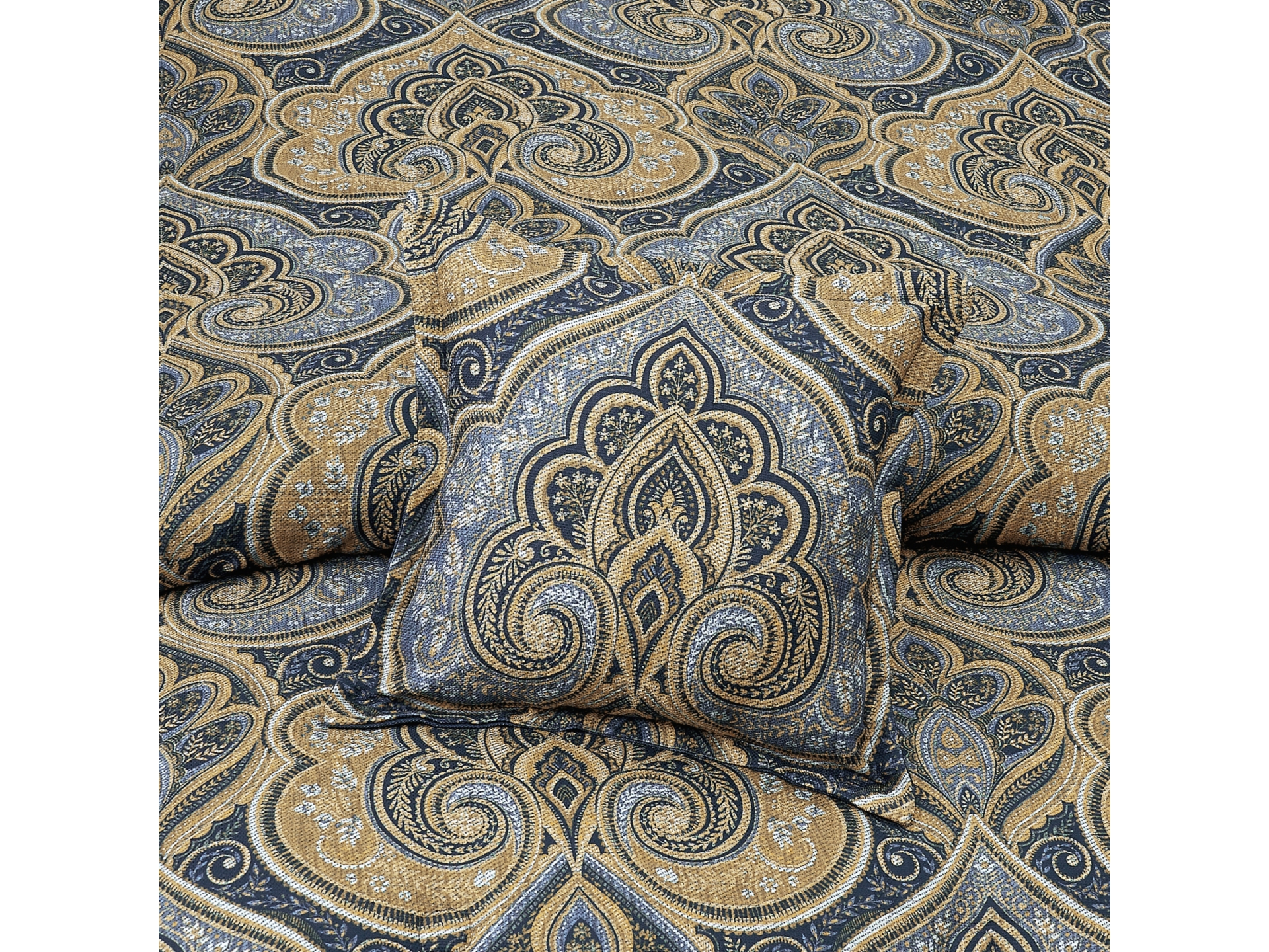 The Messina 18 Inch Decorative Throw pillow features a timeless damask perfectly centered. The dramatic woven damask pattern is crafted with a gold and navy blue color combination and it reverses to a solid navy blue brushed fabric with a flange trim for added versatility and a tonal feel. Pair this luxe accent pillow with the Messina comforter set for a complete elegant look.