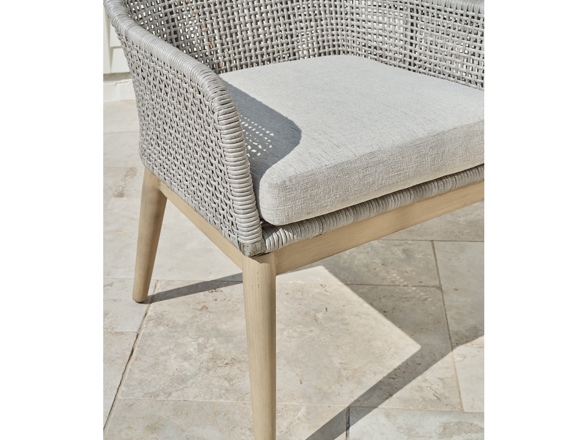 The Seton Creek dining arm chair invites your casual contemporary style outdoors. With its resin wicker in a chic neutral hue, it expertly marries refined design with durability. Breezy summer mornings and cold winter nights are made all the more comfortable with high-performance Nuvella+ fabric covering the seat cushion.