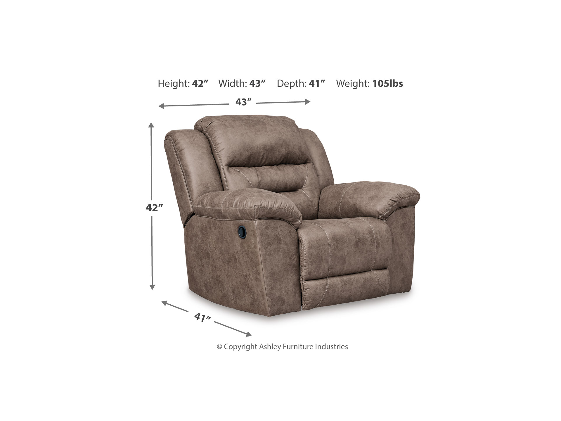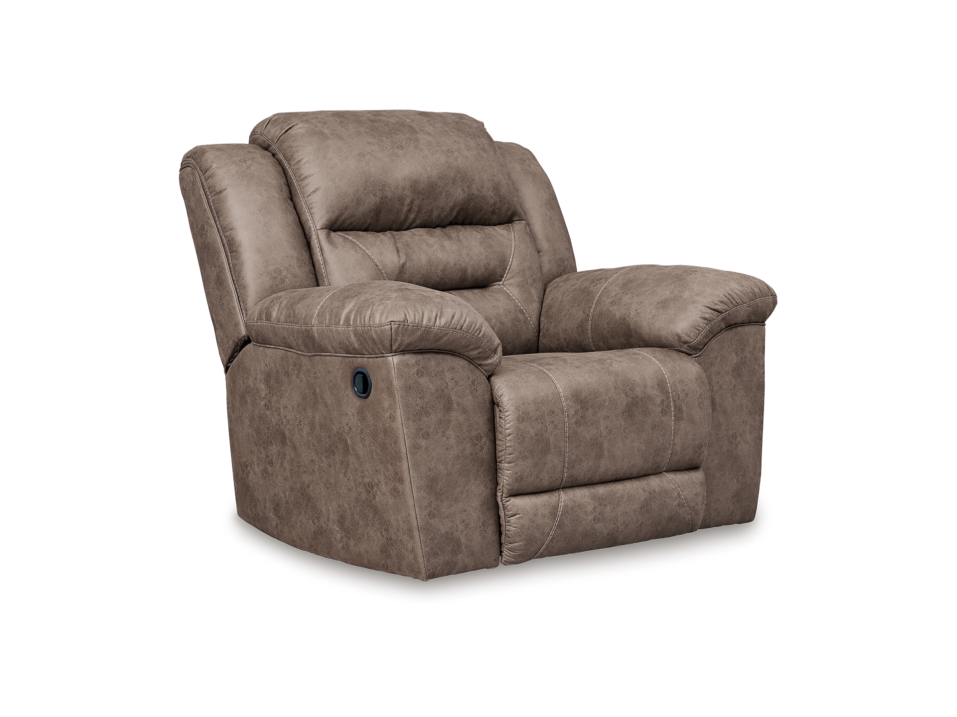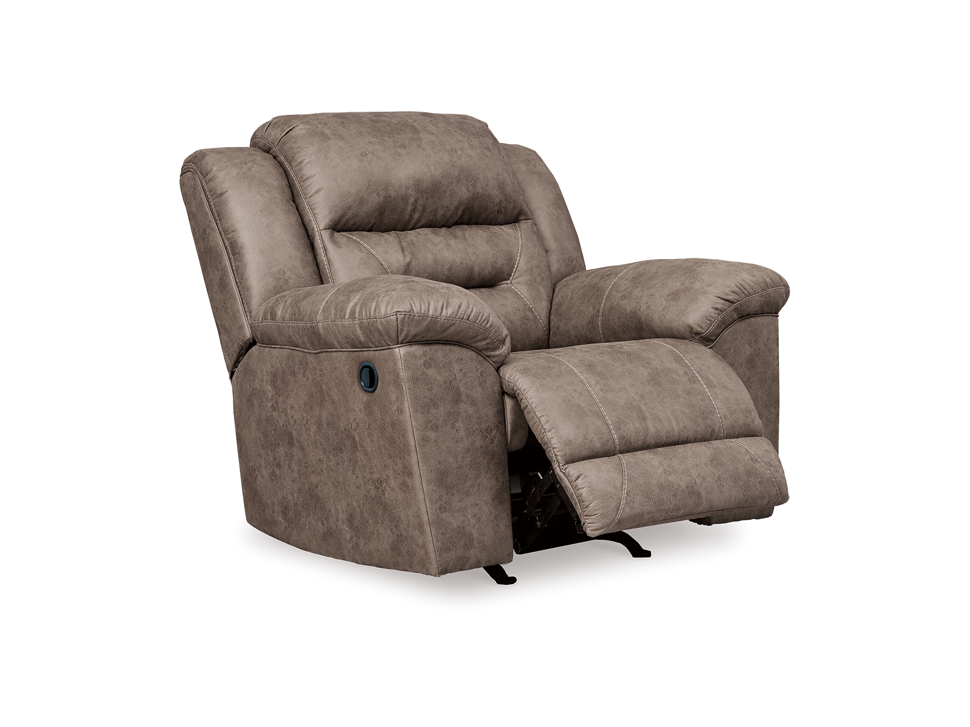 For those who love the cool look of leather but long for the warm feel of fabric, the Stoneland rocker recliner delivers both with ease. Its high-performance padded faux leather is remarkably durable and easy to clean, making it just the thing for family spaces. Channel-stitched back cushions provide indulgent lumbar support for maximum comfort—not to mention fashion-forward flair.