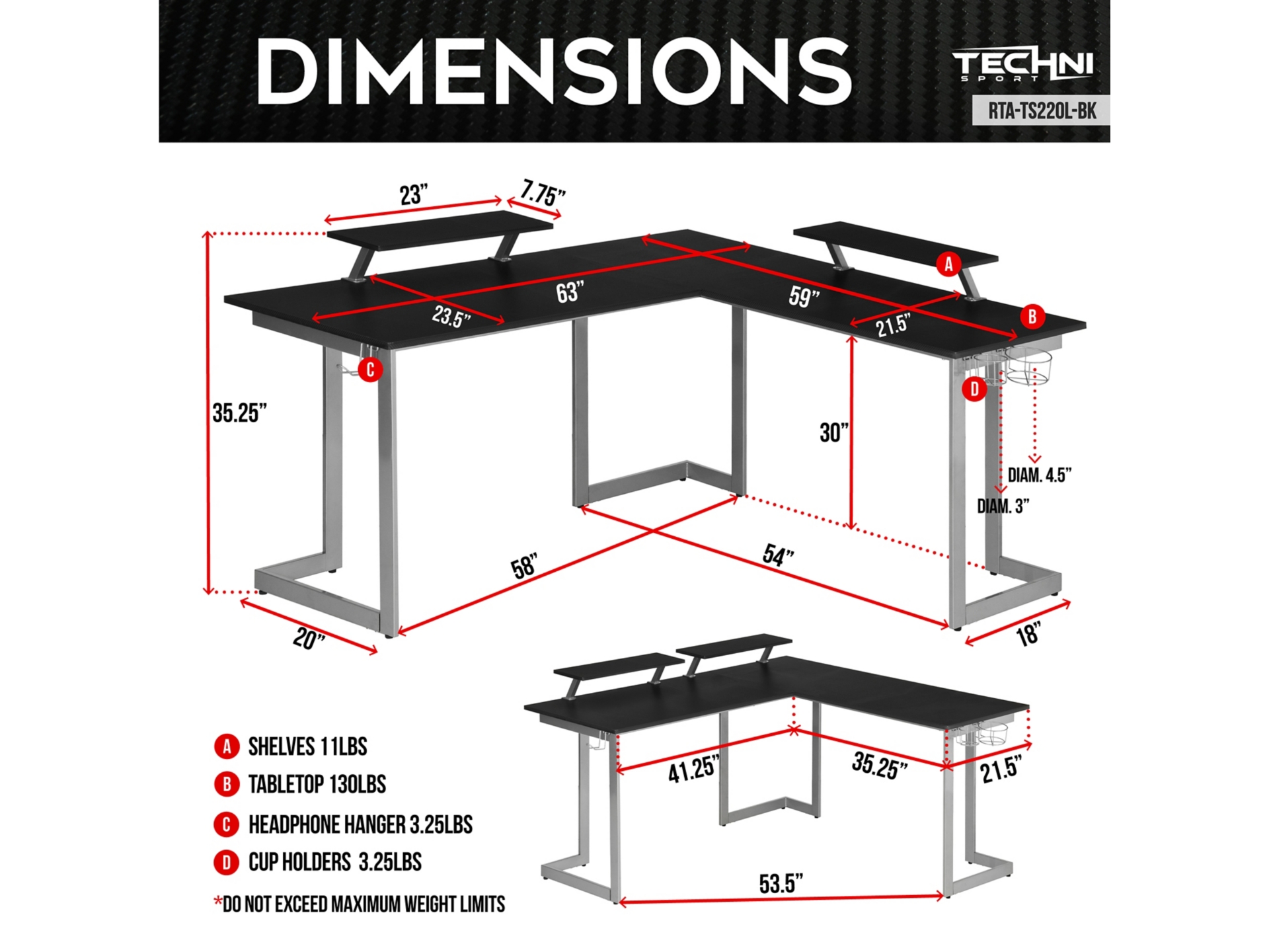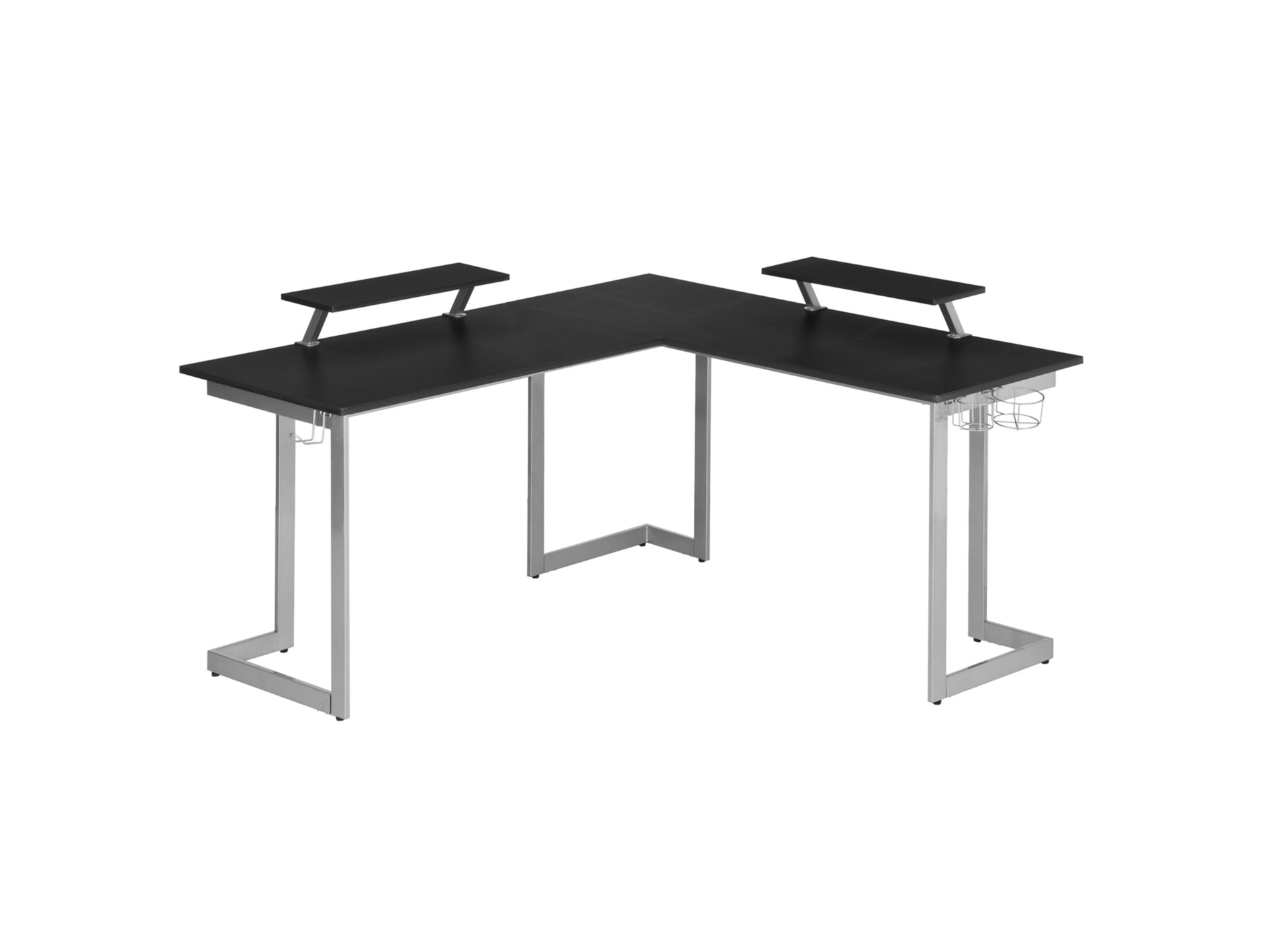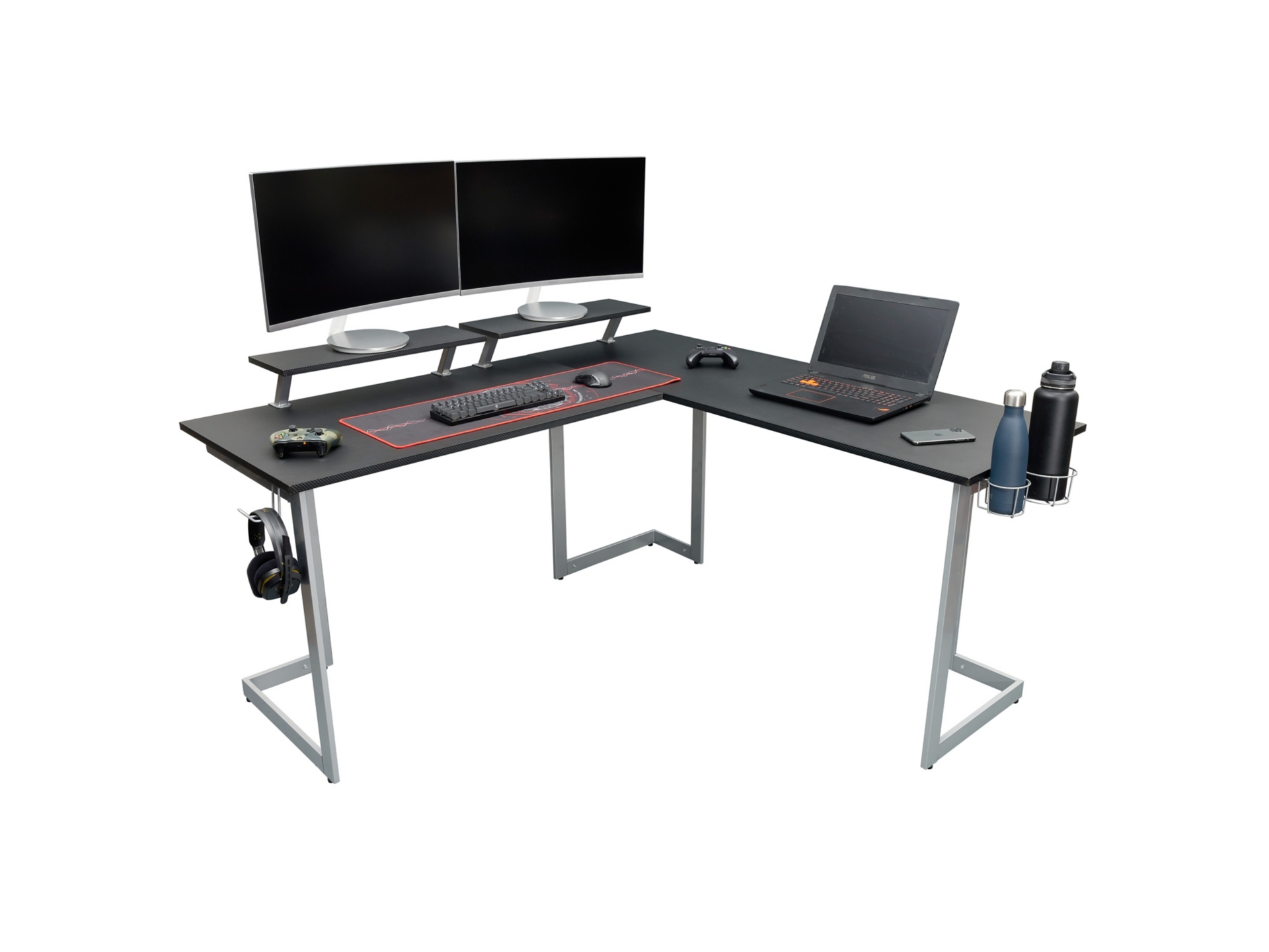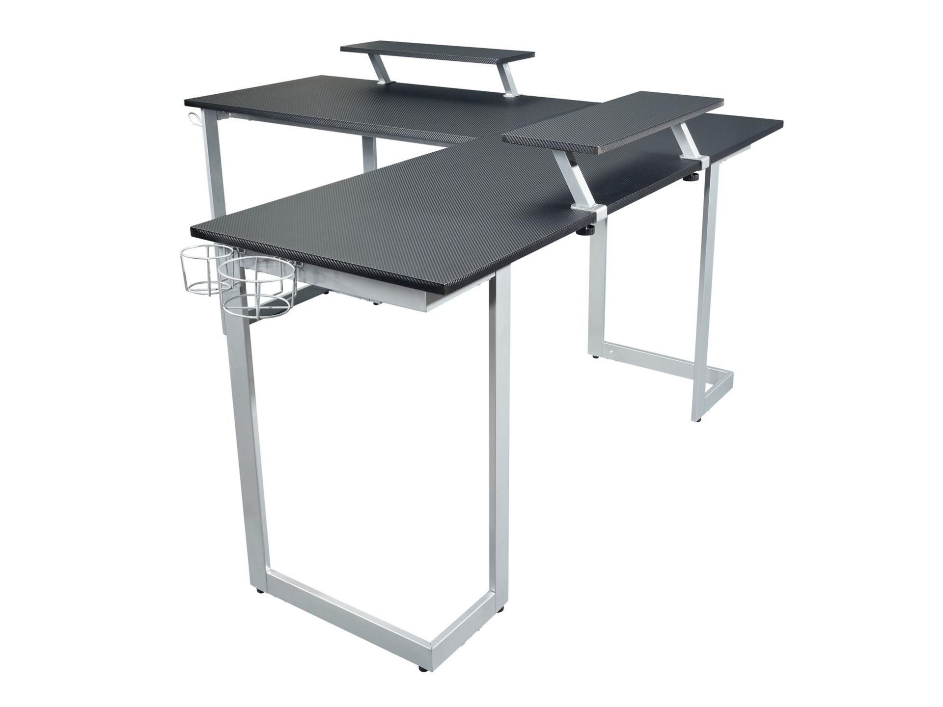 Elevate the productivity of your game with our Techni Sport Warrior L-shaped gaming desk. Maximize your floor space while being multitasking. It features two cup holders and headphone holder, easy to install either left or right side of the desk as per choice. The top surface and the two elevated and removable durable shelves are made with MDF panel, black carbon fiber like texture. Its frame is richly painted in matte silver color, made of heavy duty powder-coated steel structure. From gaming at your computer to managing daily work, this L-Shaped desk helps you get things done with ease. Weight limit: 130 lbs., comes with 5 year limited warranty.