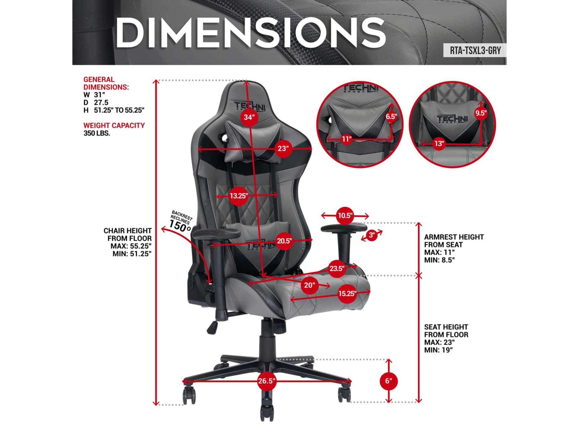 Techni Sport new addition TSXL3 is among the largest gaming chairs you can buy. Loved for its tall and wide seat frame, the TSXL3 Grey provides the ultimate comfort, larger space, design, and premium quality. #1 Gaming Chair choice for many, the GamerXL Series delivers undoubtedly a peak performance seat with increased limits for height and a weight capacity of up to 350 Lbs.