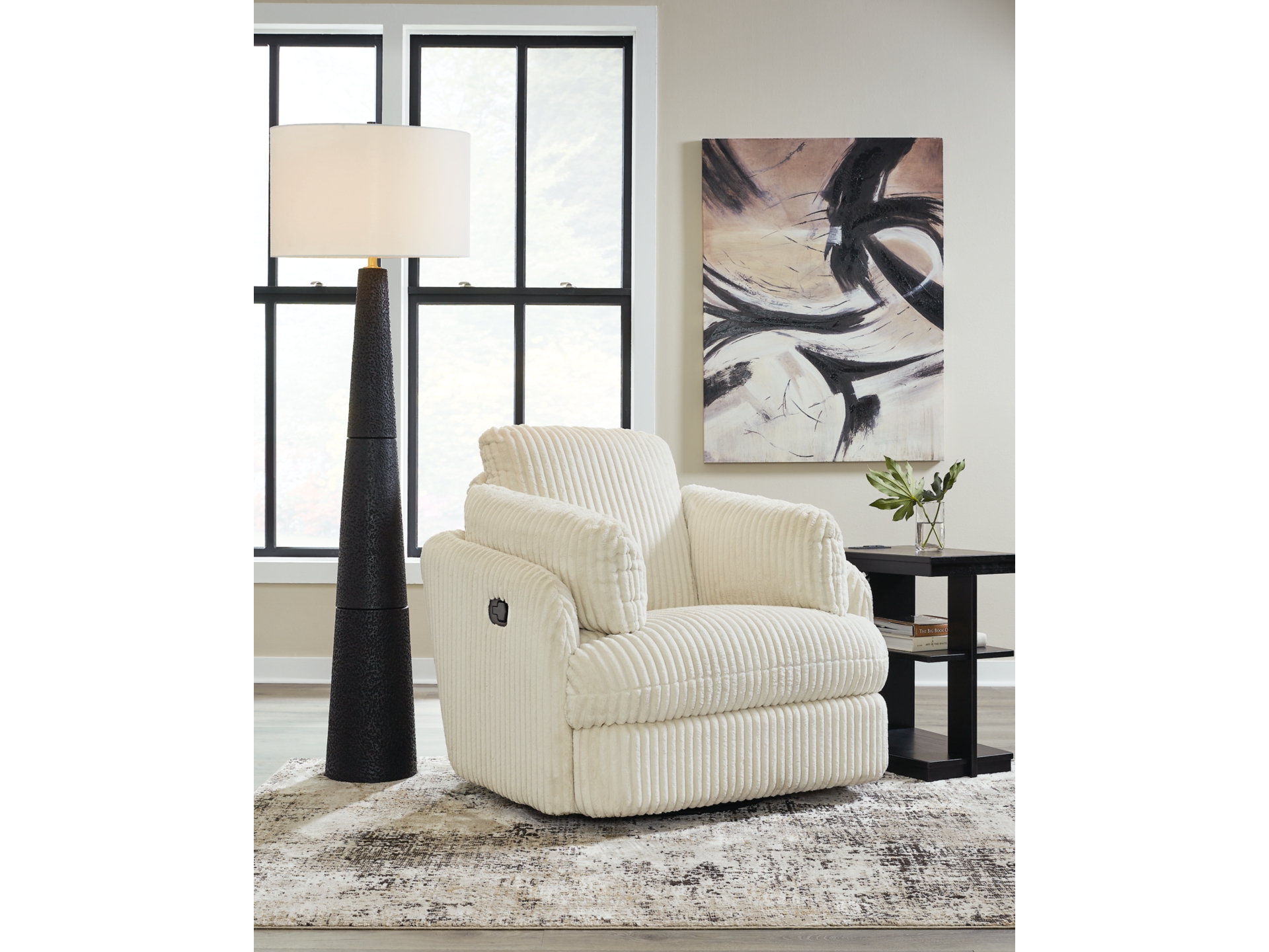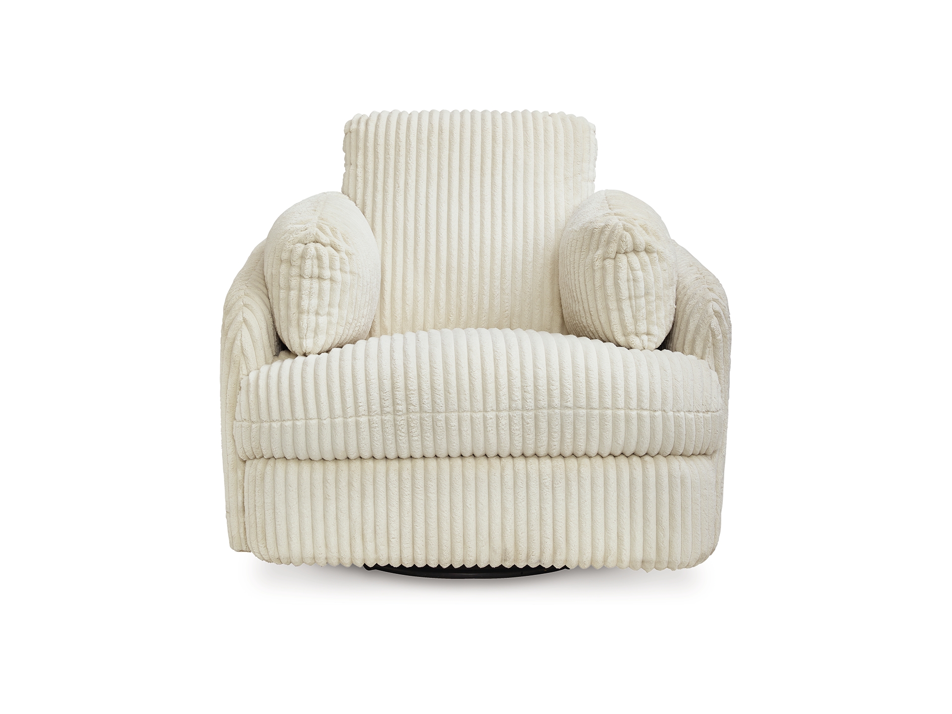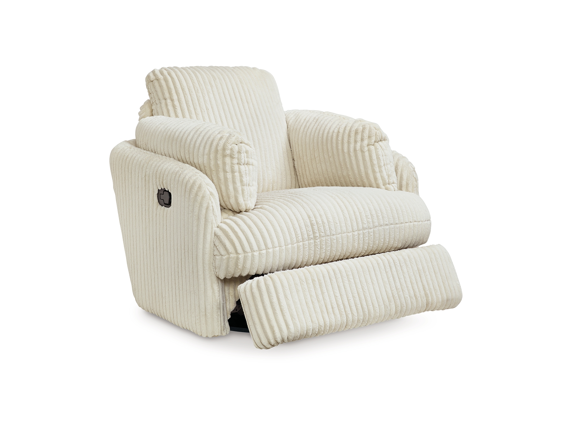 Like a warm hug, the Tie-Breaker recliner envelops you in comfort with its barrel shape and soft cord upholstery. It reclines, glides, and swivels to cater to your every need. This chair also features posh bolster pillows and cleverly designed storage. Unwind and cuddle up in your new cozy place.