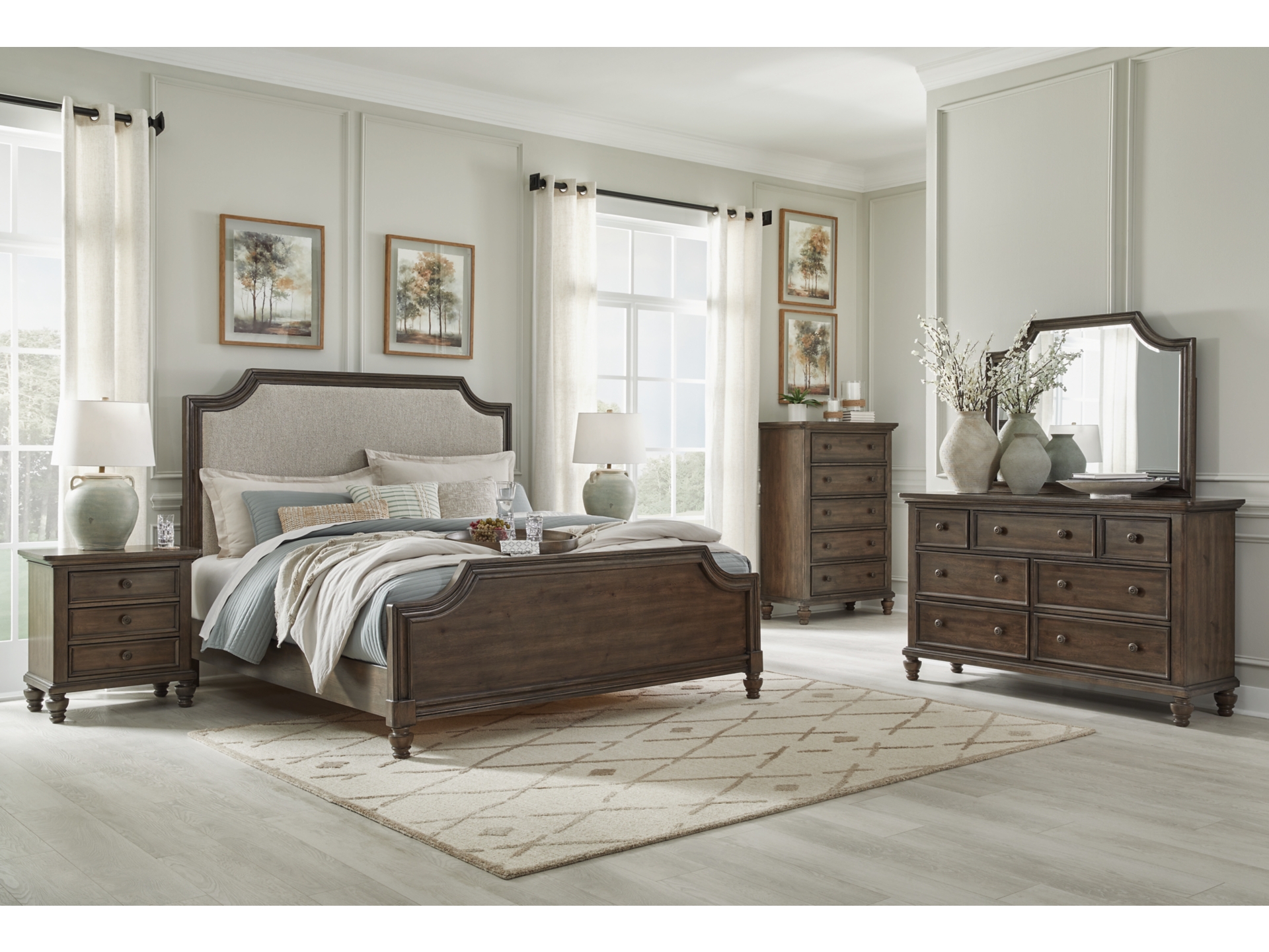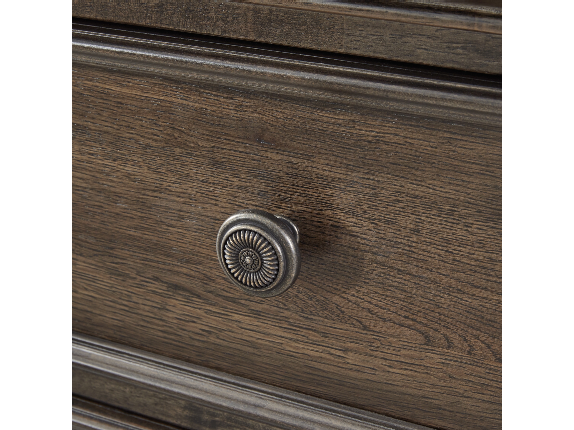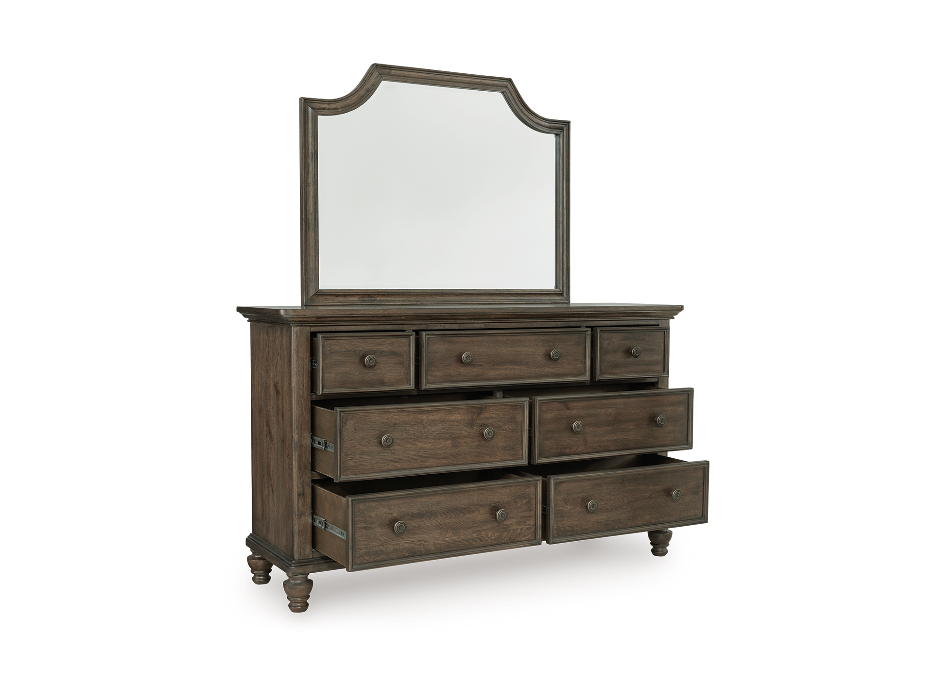For those who appreciate a traditional aesthetic with understated elegance, the Veramond dresser and mirror set brings home a dreamy look with fashionable functionality. Its rich brown walnut finish merges seamlessly with the spacious storage drawers, shapely bun feet and stylishly shaped mirror for a richly classic appeal. And did we mention the antiqued hardware?
