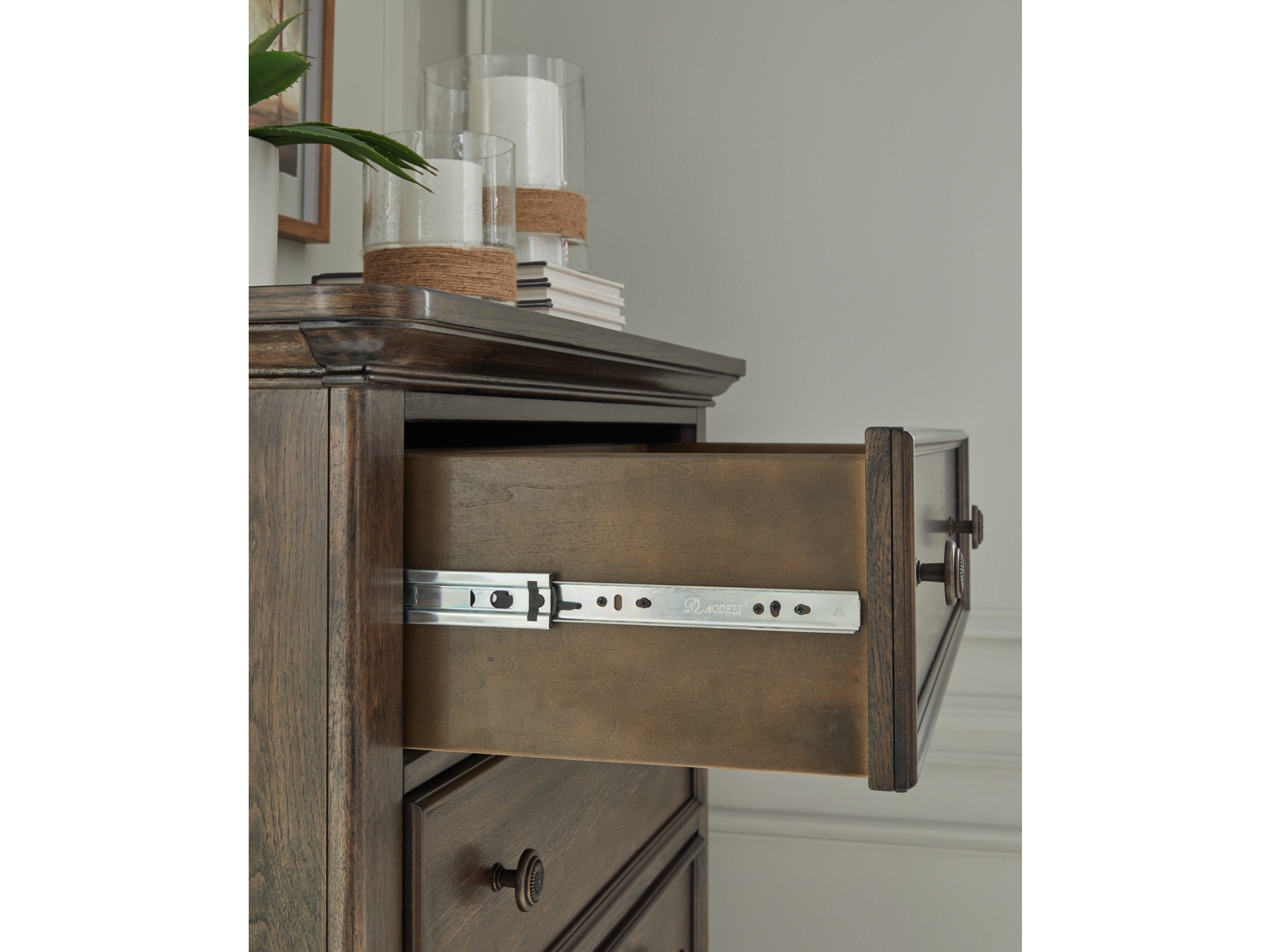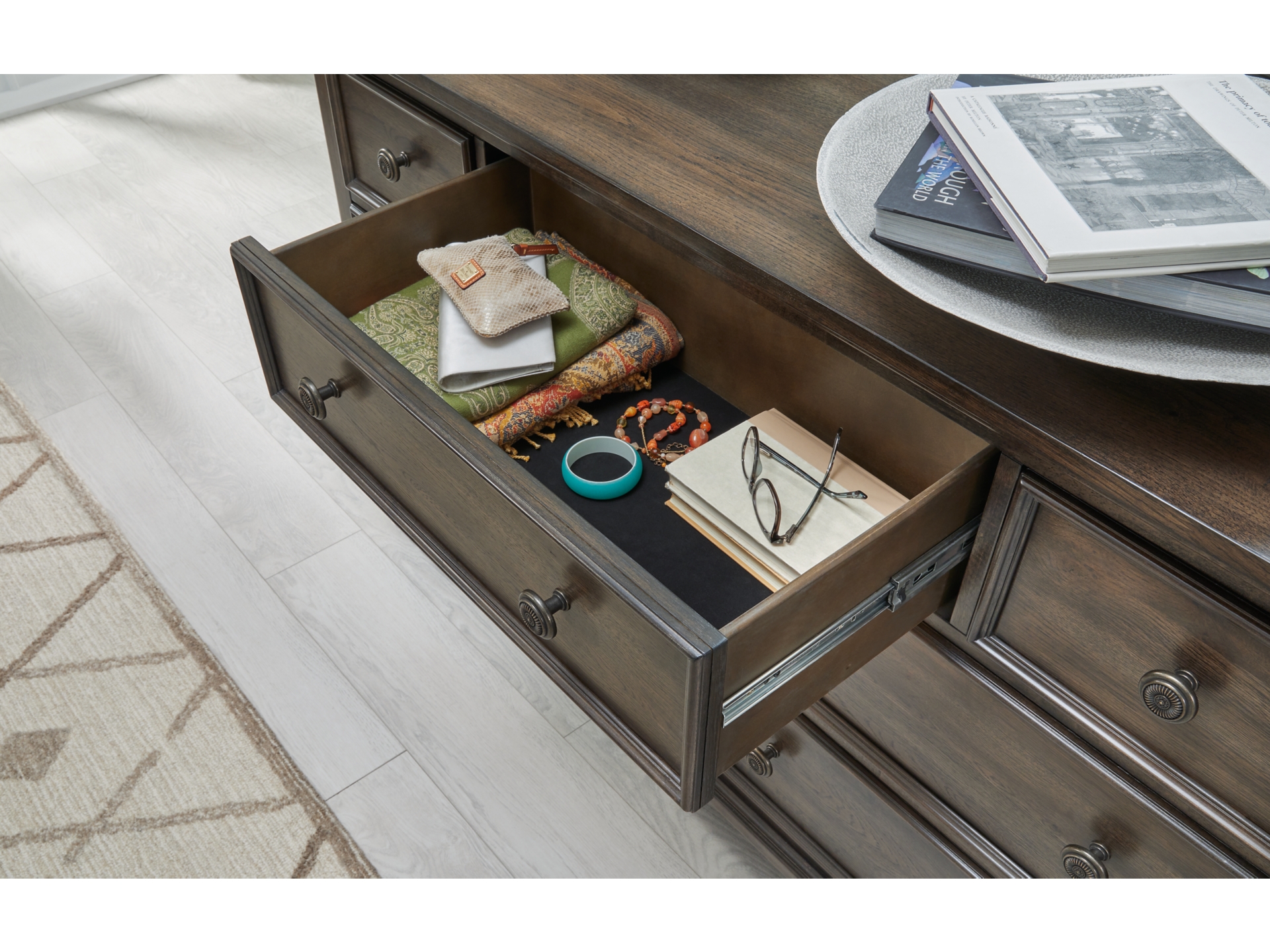 7 drawers with fully finished interiors, dovetail construction and heavy duty ball-bearing side glides (top drawers felt lined)