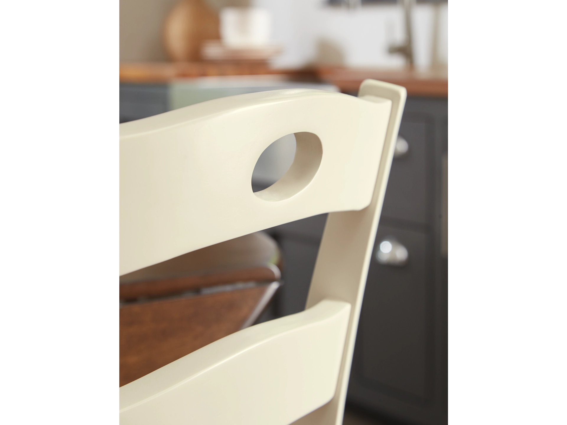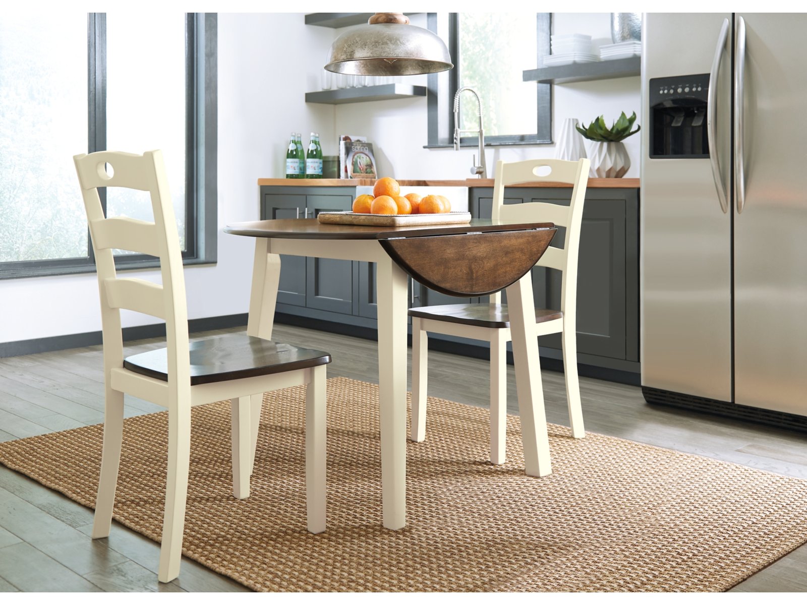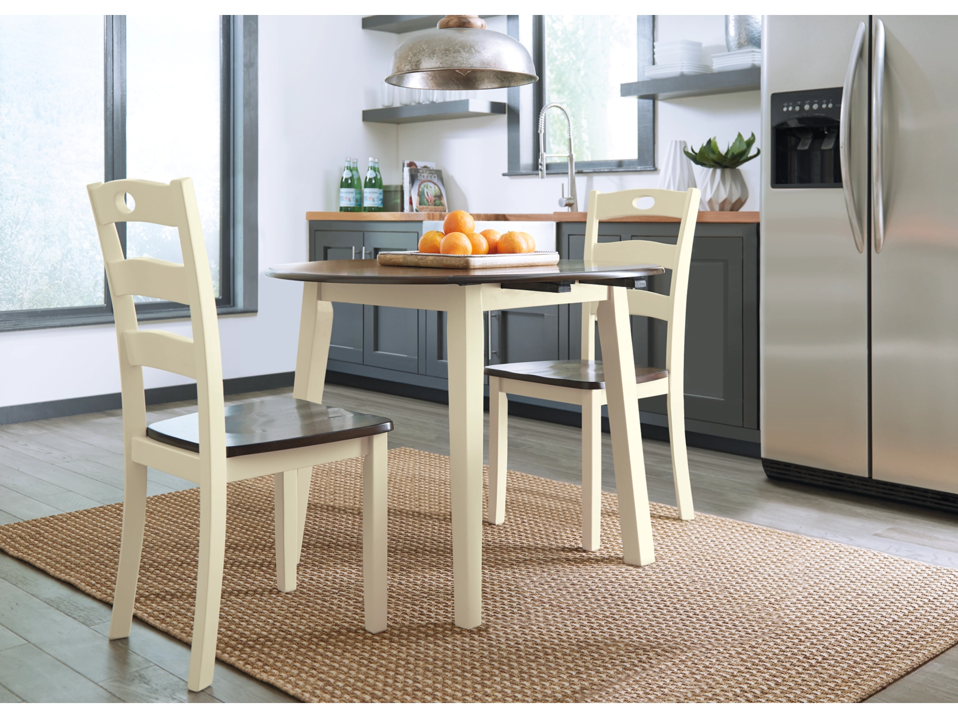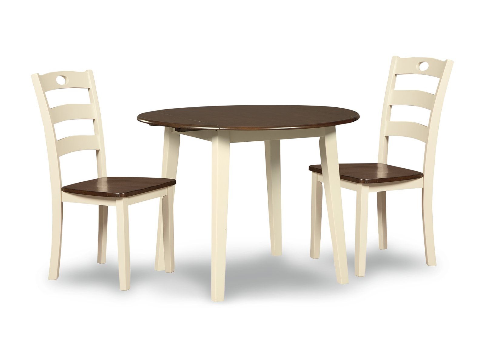 Turn your eat-in kitchen or dining space into a cottage-chic retreat with the Woodanville round dining table set. Two-tone finish serves up a double helping of charm. Chairs’ pierced ladderback design is equally sweet and sophisticated.